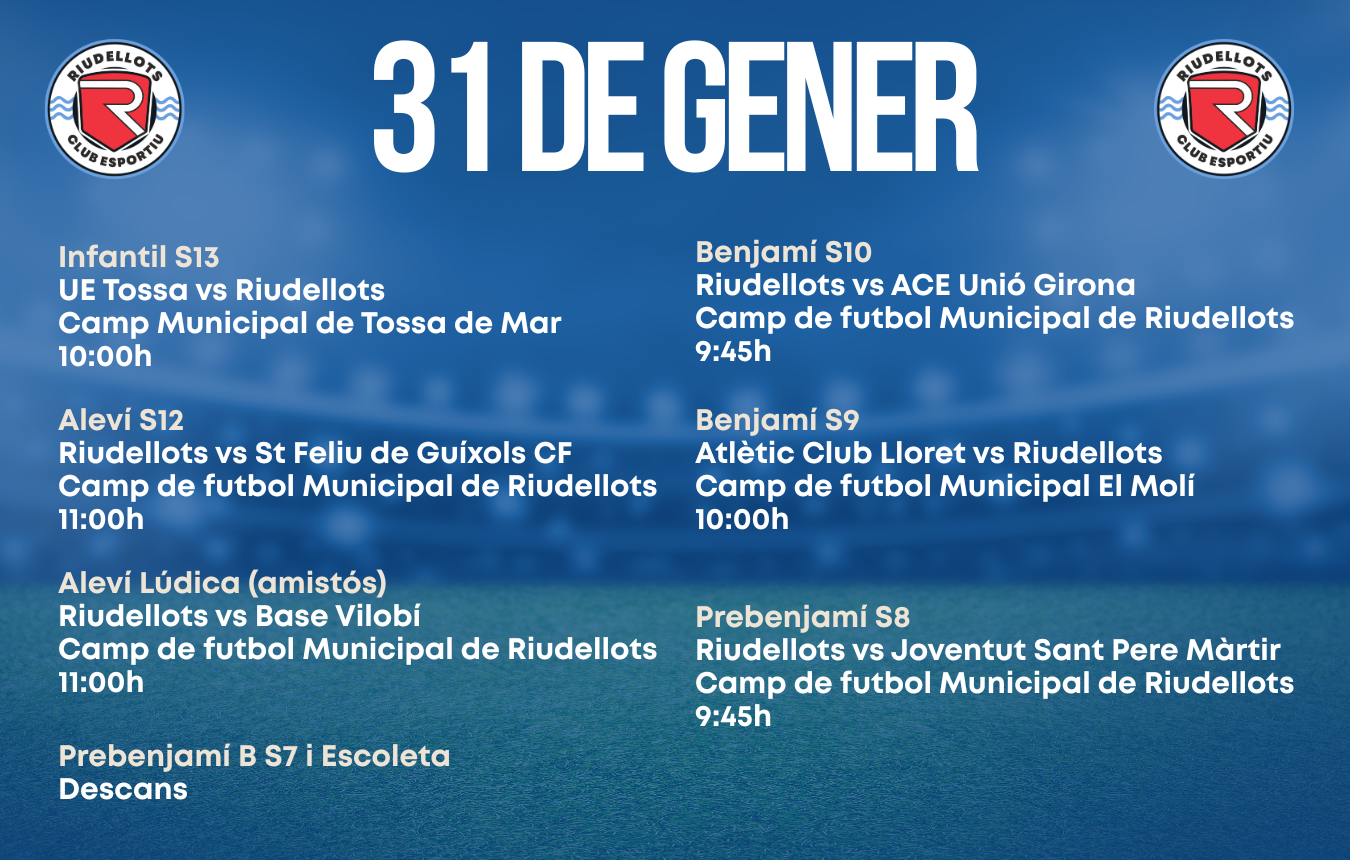 Un cap de setmana més per continuar competint, aprenent i compartint emocions al voltant del futbol. Des del club animem a totes les famílies, aficionats i seguidors a acompanyar els nostres equips i a seguir fent costat al Riudellots, tant als camps de casa com als desplaçaments. Junts, seguim creixent.