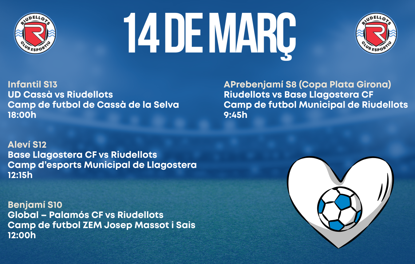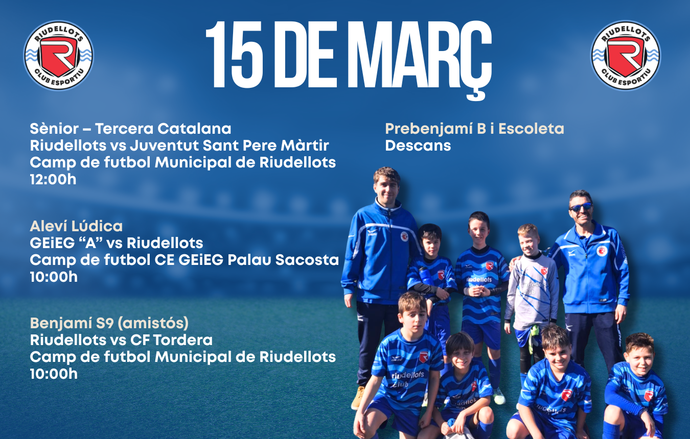 Els equips del Riudellots afronten una nova jornada plena de futbol amb partits importants tant a casa com a fora. Amb la temporada avançant, cada partit és una nova oportunitat per continuar creixent, competir amb orgull i gaudir del futbol en equip.