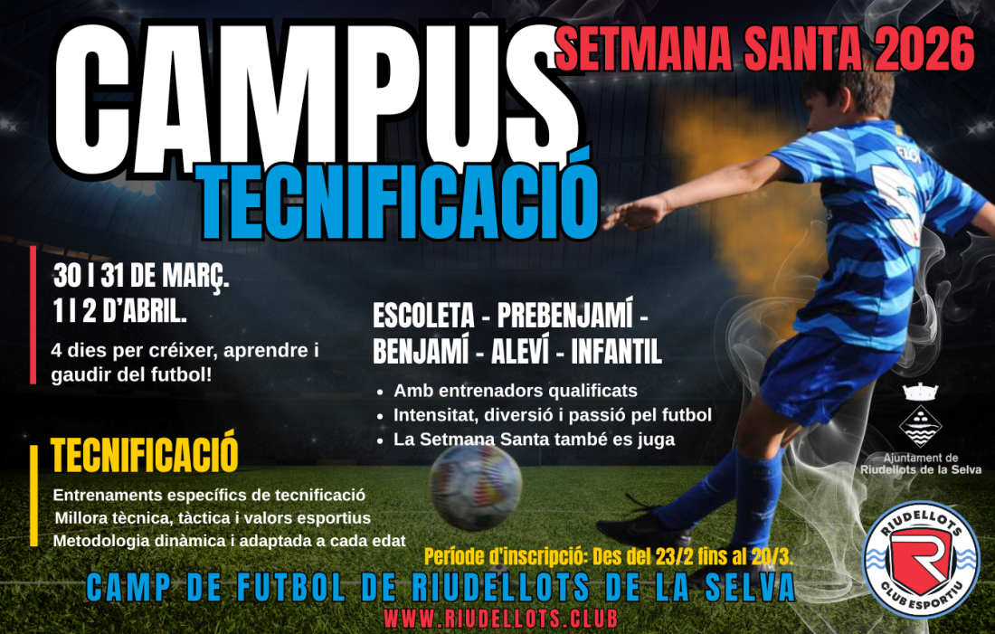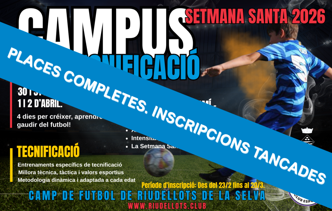 El campus es durà a terme els dies 30 i 31 de març, i 1 i 2 d’abril, amb un total de 4 dies d’entrenaments intensius, al Camp de Futbol de Riudellots de la Selva.