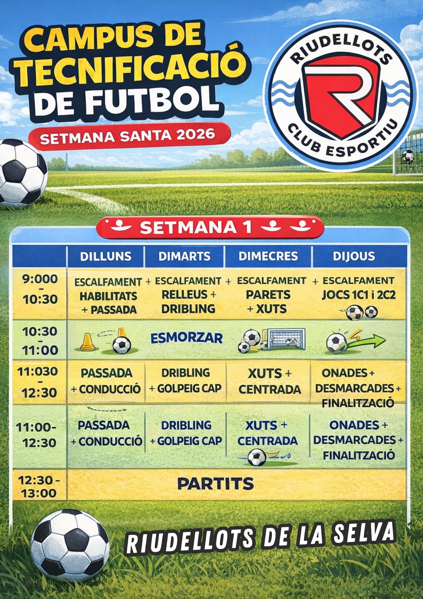 El Riudellots organitza el Campus de Tecnificació de Futbol de Setmana Santa 2026, una proposta pensada perquè els i les futbolistes del club (i de fora) puguin créixer, aprendre i gaudir del futbol durant els dies de vacances.